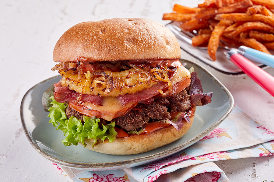 Grilled burger topped with pineapple and house garnishes. This one’s a hit and will have you doing the hula. Our signature all beef patty accompanied with a grilled slice of pineapple and avocado to make it a tropical hit of the season.